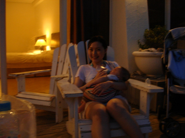 夕陽西下 ~ 媽咪看著黑嬤嬤的海邊聽著轟~轟~的海浪聲 慵懶的躺在涼椅上為我喝ㄋㄟㄋㄟ...