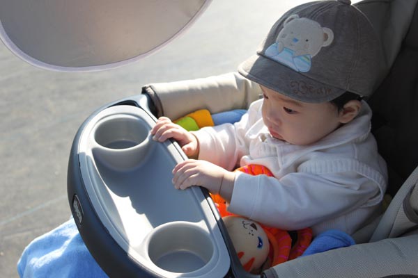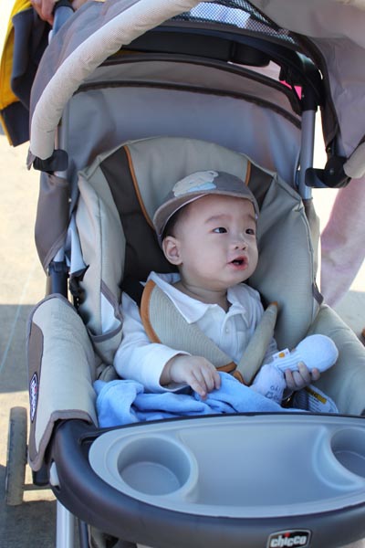 小肉球變成大肥肉球坐在推車裡啦 ~ 還有專屬遮陽板耶 ~