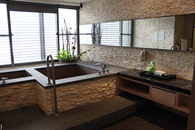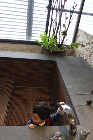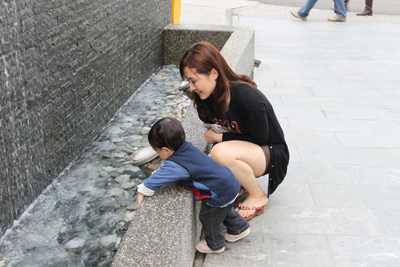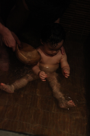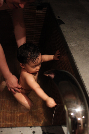 可以泡湯了嗎? 哇.. 小乖比浴池還高耶!