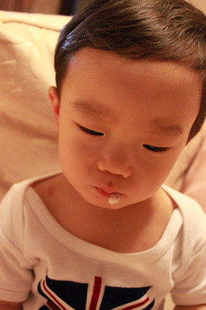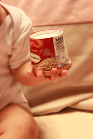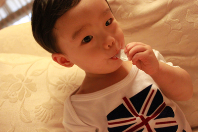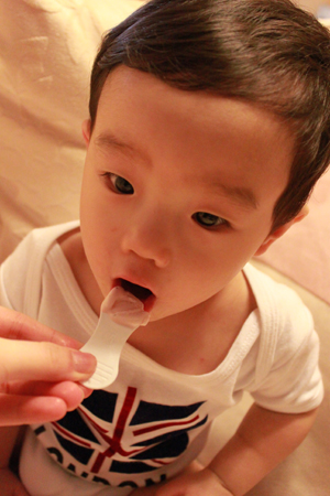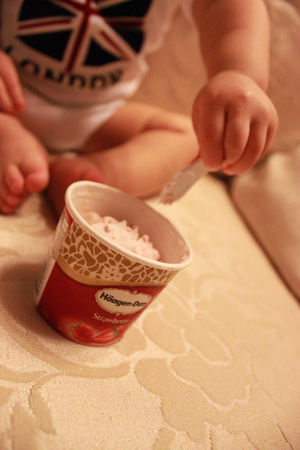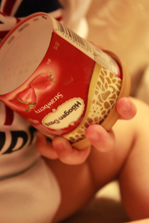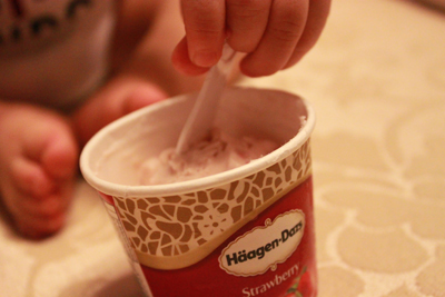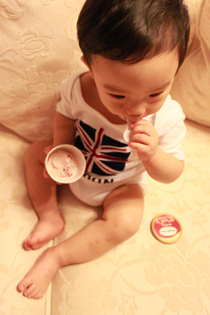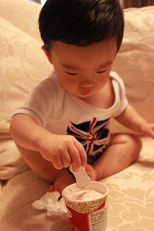 媽媽佛心來的打開讓小乖嚐嚐這個叫做 "冰淇淋" 的東西!