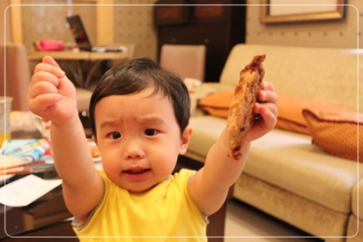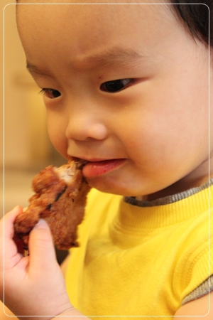 蛤 ~ 這小子自己去拎了塊 "排骨肉" 吃了起來..!!