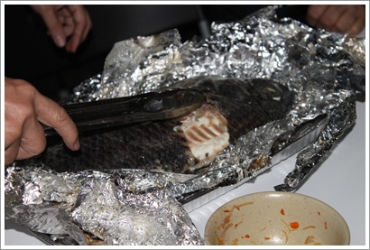 烤吳郭魚耶.. 在幫魚脫衣服 .. 好妙喔.. 好像穿罩衫的魚喔.. 一脫就整件脫掉..