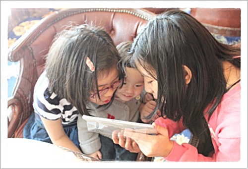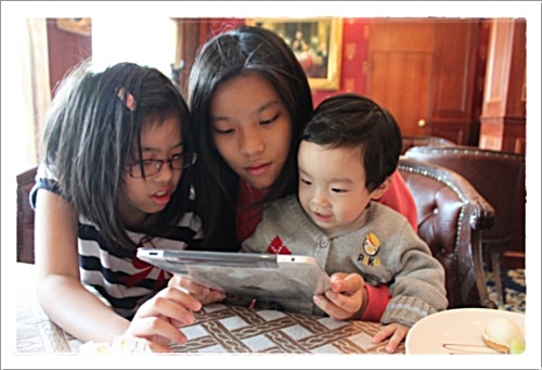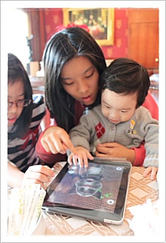小乖爸你看.. 你看夾在姐姐們中間.. 露出滿臉滿足笑容的兒子多愛IPAD阿