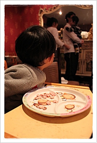 滿到.. 我的位子在.. 小乖右手那一小小塊大理石是我的用餐桌面..