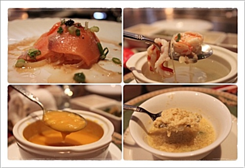 洋蔥鮭魚 + 海鮮清湯 + 玉米濃湯 + 蟹糕煮的湯
