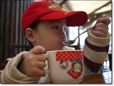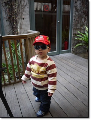 結束了布丁乳酪後.. 小子拔掉圍兜..帶上帽子.. 帶上眼鏡說 "媽媽走吧~"