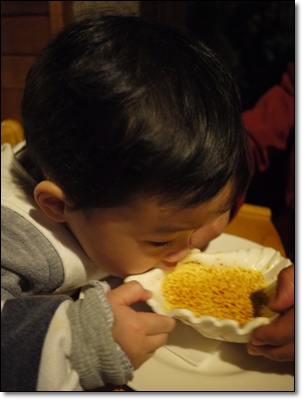 黑黑的焦糖部分吃光後.. 小子一整個有點懊惱+不愉悅..