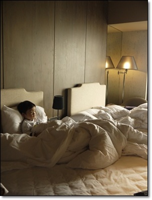 很有一家之主的架勢..坐臥在床上!!