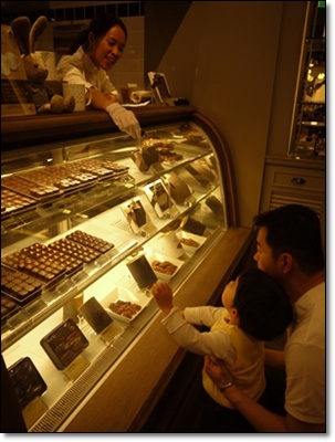 不得了了..這小子不走..站在巧克力前一直點著玻璃櫃裡的某款巧克力說