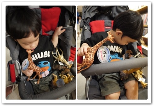 兩隻長頸鹿..一隻獅子.. 一隻乳牛.. 小乖好開心好開心喔.. 一直要讓他們跟他一起擠在一起!