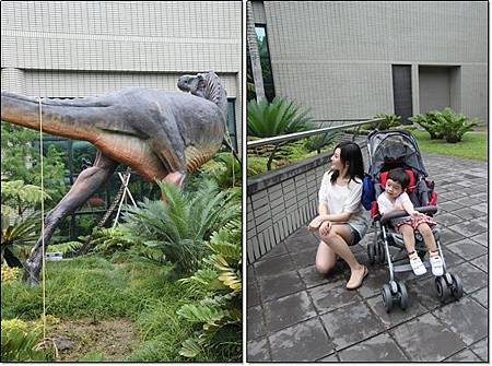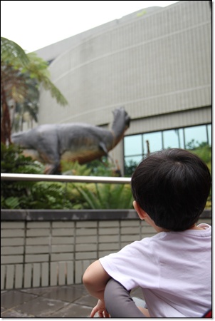 颱風天耶.. 真的館內人員來把恐龍固定住耶... 難不成怕恐龍被吹走??
