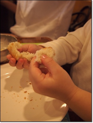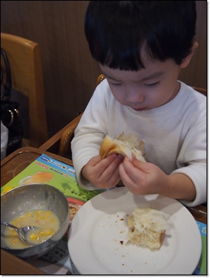 小乖說他在學爸爸... 拿麵包沾玉米濃湯..