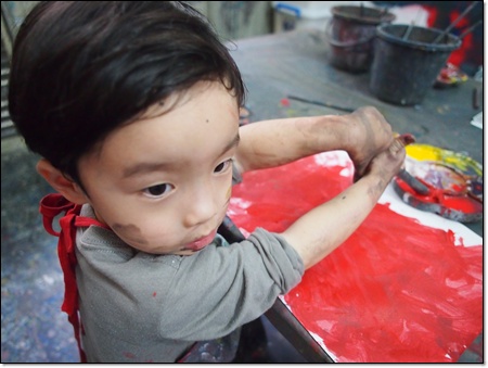 小乖很放的玩起來了..本來都小小聲問我.."媽媽我可以用手沾顏料嗎?"