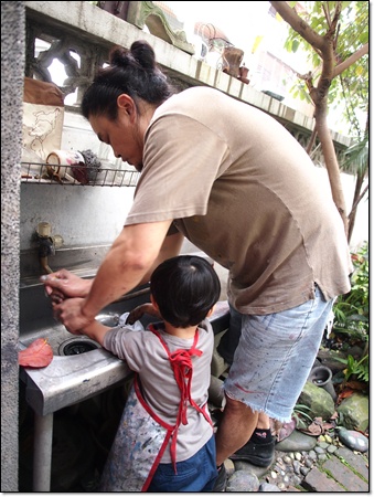 一隻一隻輪流老師會幫忙刷乾淨...老師說連肥皂都他自己做的..