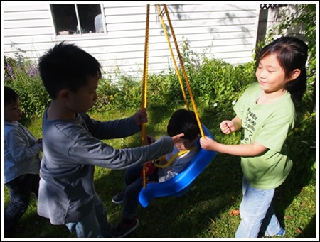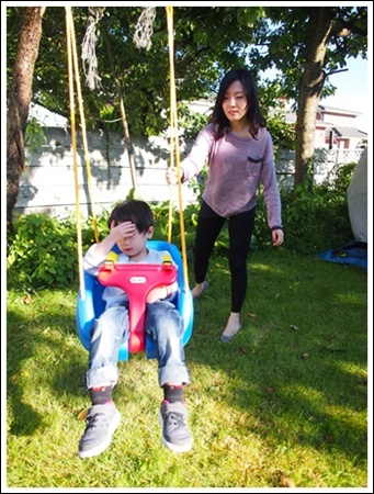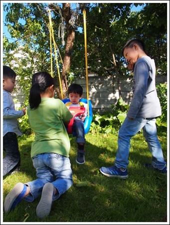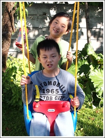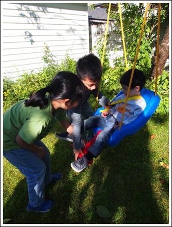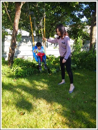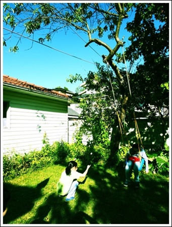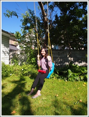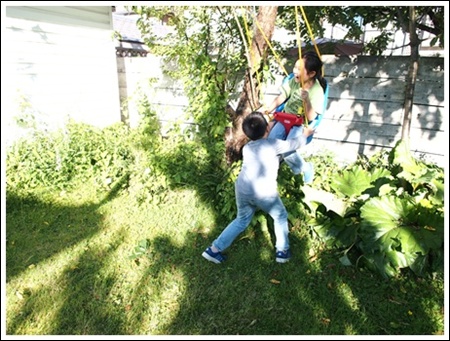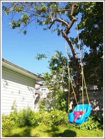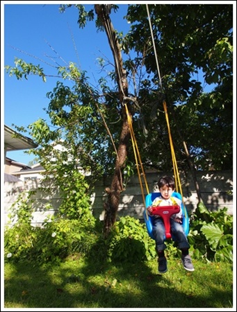 聖誕老公公 Sam 哥竟然搬出盪鞦韆...掛在他們DIY 在棗子樹上的繩子上...