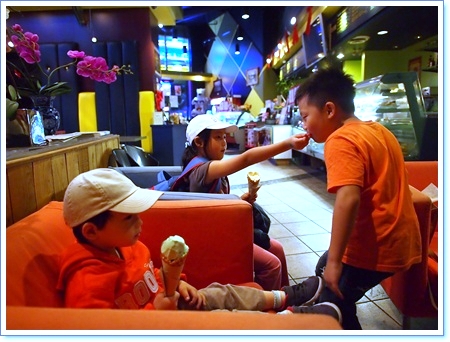 瞧瞧後面的兄妹, 打架歸打架, 妹妹還是不吝嗇的跟自己的哥哥分享...這就是手足之情阿~
