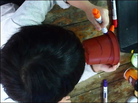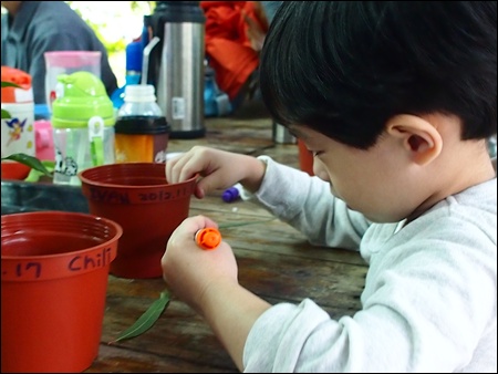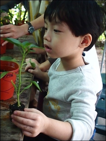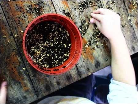 一次一次邊抓邊掉太少土, 小乖自己跑去拿了一個本來裝小辣椒苗的塑膠膜殼當碗來盛土