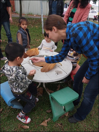 看到圓桌看到樹葉就坐下來說來烤肉囉~~~