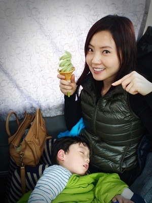 小乖睡攤了在我腿上, 小乖爸在休息佔買了綠茶霜淇淋慰勞辛苦的我..哈