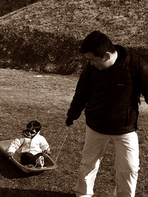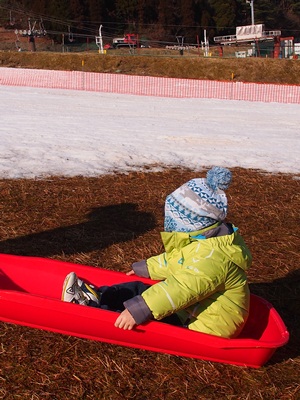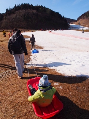 沒人理小乖他就自己拖著雪盆往山上奔~