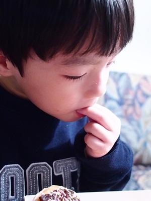 悠閒的夜晚我看著日文雜誌, 吃著甜甜圈, 小乖看日文卡通...還頗愜意~